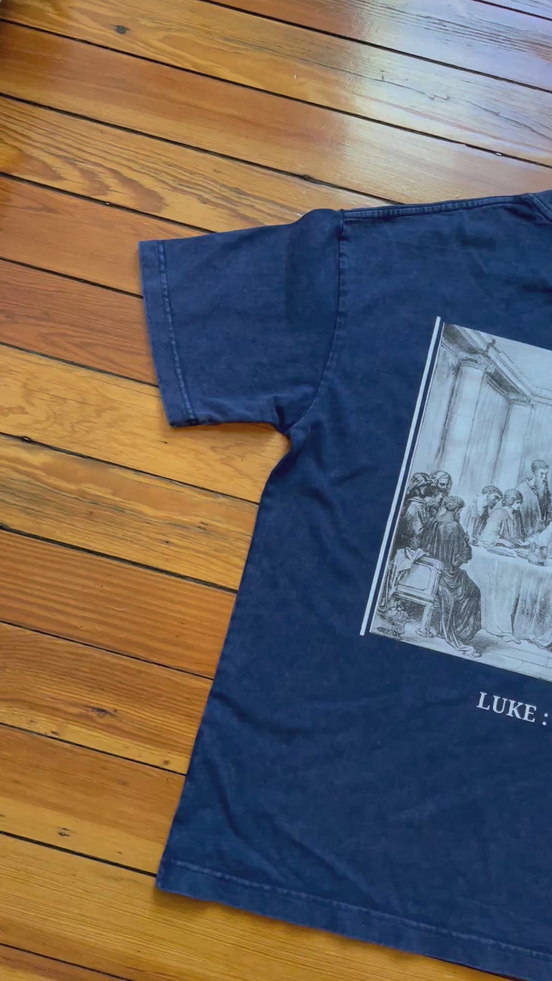 ⚬ On the back, a detailed screen print illustrates Jesus seated at the Last Supper with His disciples, referenced below is Luke 22.